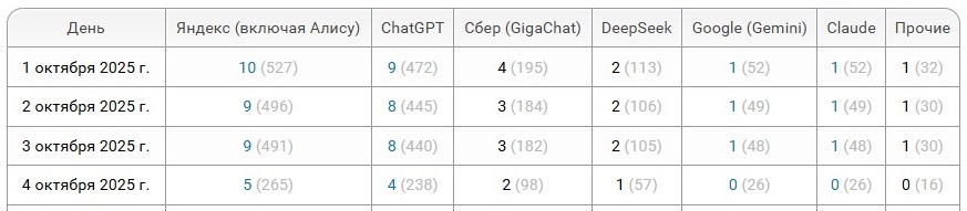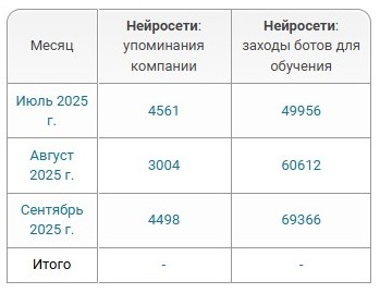 Мы ведём серверную статистику посещений ботами нейросетей, показывающую ориентировочные данные: